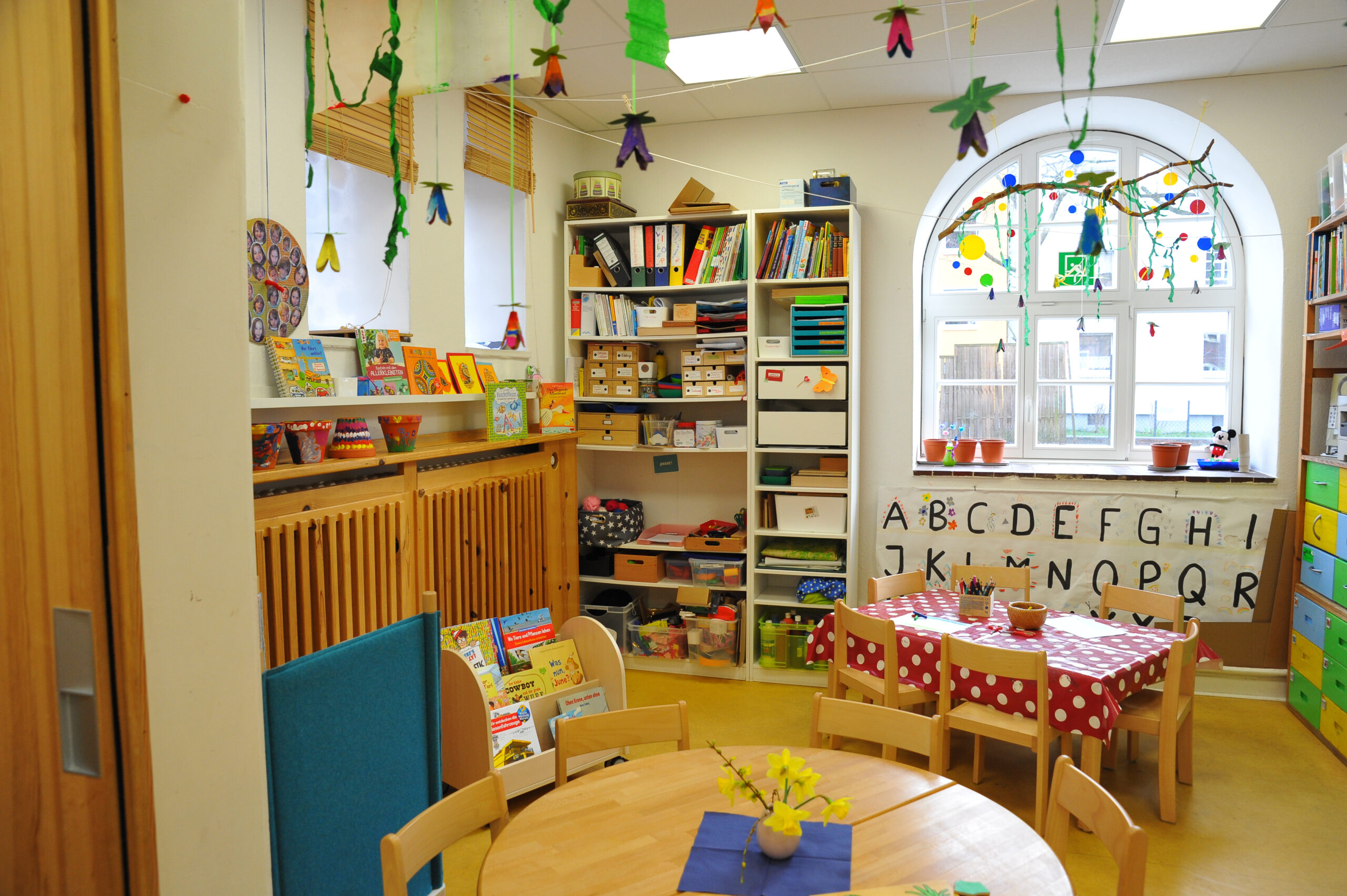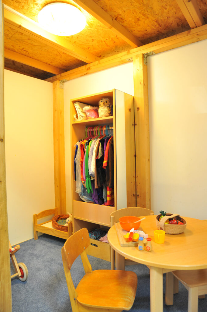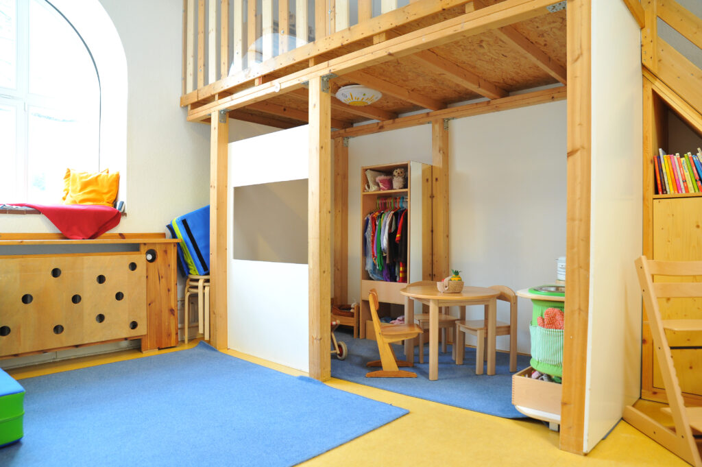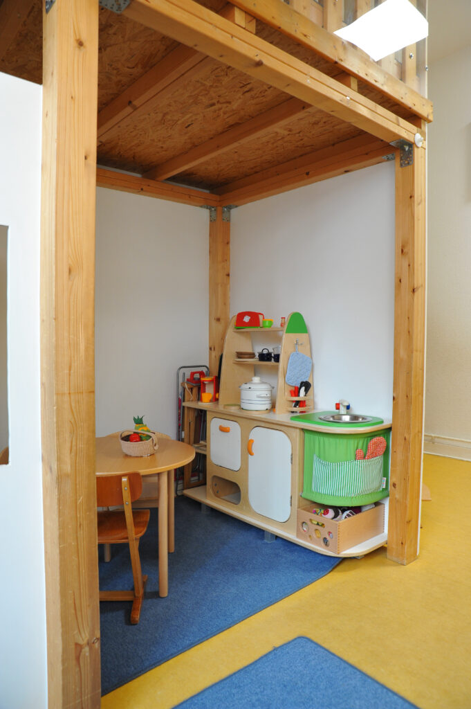 Zur Einrichtung gehört nicht nur altersgerechtes Material, auf das die Kinder zurückgreifen können. Auch ein weiterer Raum mit Hochebene bietet tolle Spielmöglichkeiten und zusätzliche Angebote. Außerdem steht ein großzügiges Außengelände mit diversen Kletter- und Spielgeräten, die die Kinder gerne und bei jedem Wetter nutzen, zur Verfügung.